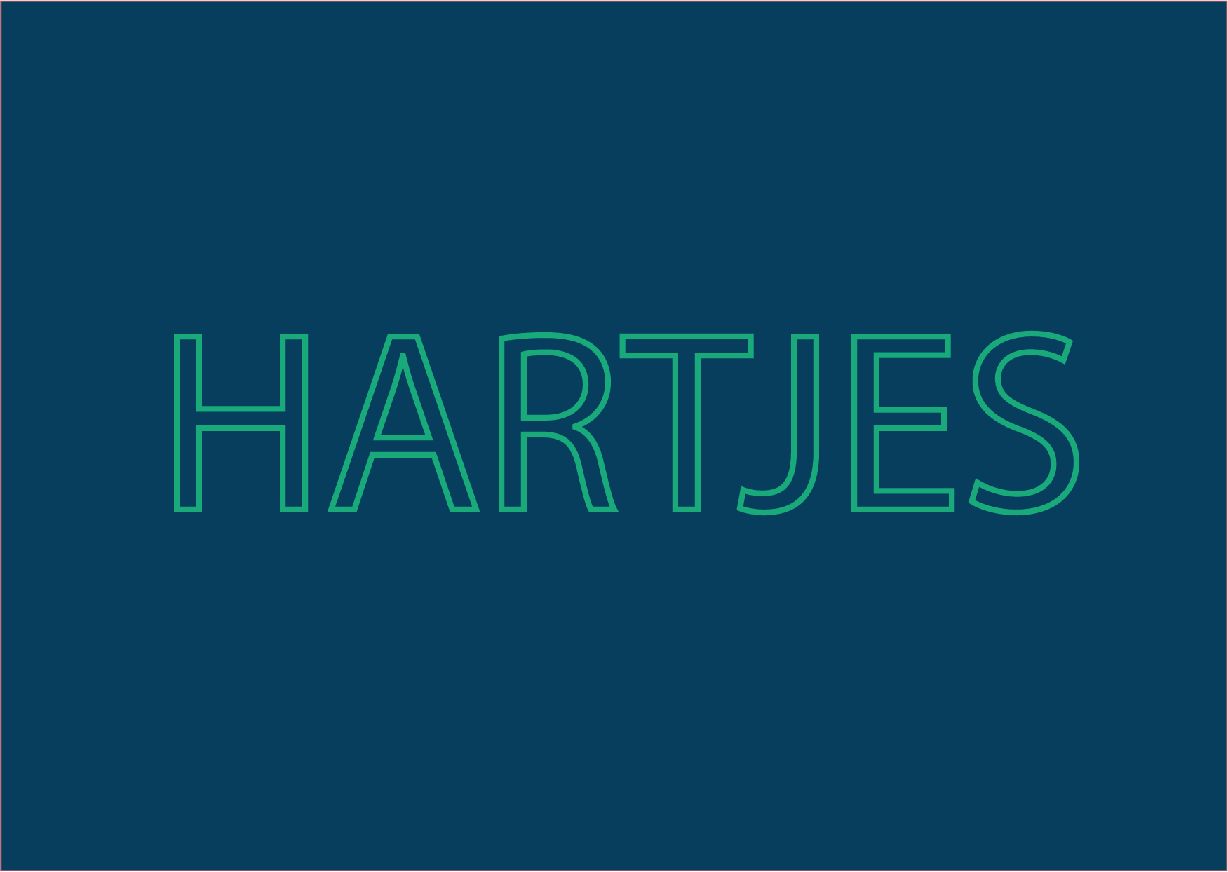 Blauwe ansichtkaart met in het groen de tekst “HARTJES “